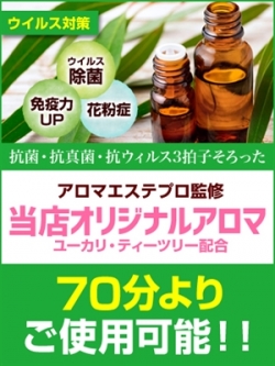 〜新型コロナウイルス対策〜 ※受付の際、ご要望をお伝え願いますm(__)m お客様が安心して当店をご利用して頂くため、 新型コロナウイルス感染拡大に対して 様々な取り組みをしてまいります。 アロマエステ専門の当店だからこそできる アロマ資格を持つプロエステティシャンに 監修していただき ウイルス対策専用の “オリジナルアロマオイル”を 作成しました。 ▼配合 『ユーカリ』 殺菌効果があり、免疫力を高めます。 香りは花粉症にも効果あり。 『ティーツリー』 強力な抗感染作用を持ちます。 様々な皮膚のトラブル解消にも効果的です。 コースの制限なく どなた様でもご利用いただけます。 どうぞお気軽に 担当セラピストへお申し付けください。 ※香りが強い精油になります。 苦手な方やご都合悪い方は 従来通り無香料のアロマオイルをご利用ください。 ご希望ございましたら セラピストがマスク着用で お伺いします。 ご予約受付の際にお申し付けください。 |