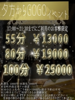 ☆夕方から GOGO☆ 17時〜21時30分までに お遊び頂けるお客様には 『夕方からGOGOイベント』で 特別価格にてご案内致します! 通常60分 20,000円 ↓ ↓ ↓ ↓ 55分 13,000円 通常80分 26,500円 ↓ ↓ ↓ ↓ 80分 19,000円 通常100分 33,000円 ↓ ↓ ↓ ↓ 100分 25,000円 ※栄町指定ホテル限定 ※指名 1,000円・本指名 2,000円 ※30分以上先のご予約は+1000円・前日予約は不可 ※受付の際に『夕方GOGO』とお伝えください ※他の割引と併用不可 ※30分以上先のご予約は予約料1,000円 |